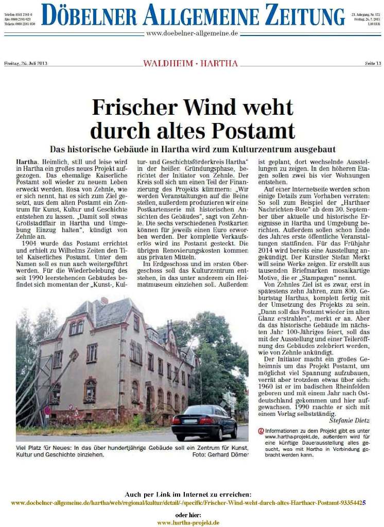 "Kaiserliche Postamt" zu Hartha-Stadt wird künftig ein Kunst-, Kultur- und Geschichtszentrum! Ab Frühjahr 2014 sind